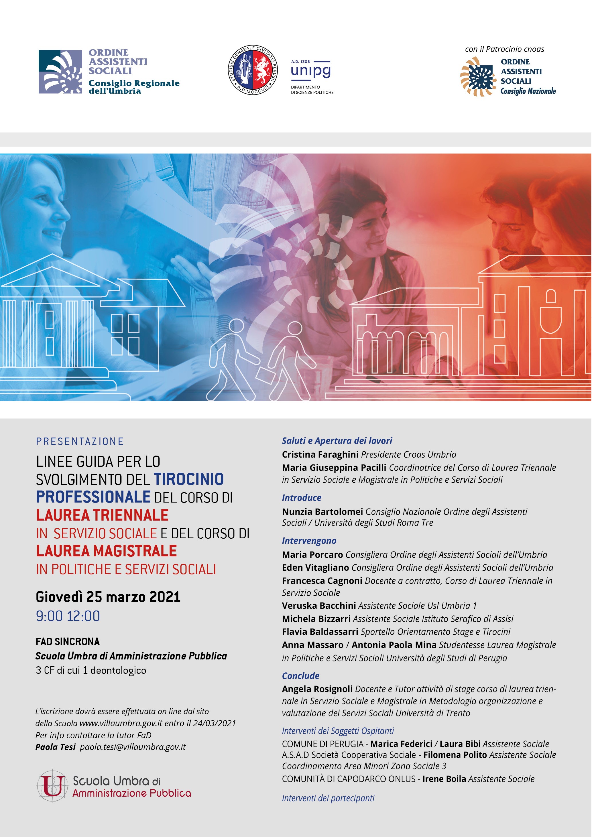 Giovedì 25 marzo 2021 si svolgerà l'evento "Linee guida per lo svolgimento del tirocinio professionale del corso di laurea triennale in Servizio Sociale e del corso di laurea magistrale in Politiche e Servizi sociali" rivolto sia alla comunità professionale che a quella studentesca universitaria.