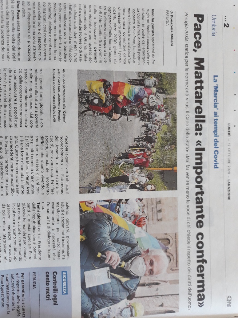 PERUGIA – C’erano anche tanti assistenti sociali alla Catena Umana per la pace e la fraternità. A Perugia, nel primo tratto di San Girolamo, presenti le massime rappresentanze della categoria «non solo per festeggiare i 25 anni dell’Ordine, ma per dare un segno della professione rispetto alla costruzione di equità, pace e diritti per tutte le persone, soprattutto quelle che in questo momento di pandemia non sono tutelate come dovrebbero». A dirlo il presidente nazionale dell’ordine Gianmario Gazzi, secondo cui «l’unico modo per costruire una società inclusiva e giusta è garantire a tutti l’accesso ai diritti sociali e alla salute globalmente intesa». A rappresentare l’Umbria, fra gli altri, Cristina Faraghini presidente del Croas: «Ci siamo per rappresentare quello che facciamo tutti i giorni, il nostro impegno per costruire una società, contesti e luoghi di vita più rispettosi dei diritti, della solidarietà e dell’accoglienza». È un lavoro, quello degli assistenti sociali, che come altri ha dovuto fronteggiare l’emergenza Covid-19. «Stiamo portando avanti ricerche, abbiamo dovuto adattare metodi e strumenti di lavoro all’emergenza. Ci stiamo occupando dei contesti delle famiglie dove sono emerse nuove povertà e nuove difficoltà». L’impegno della categoria, con il filo della pace, si è unito a quello di altre realtà.