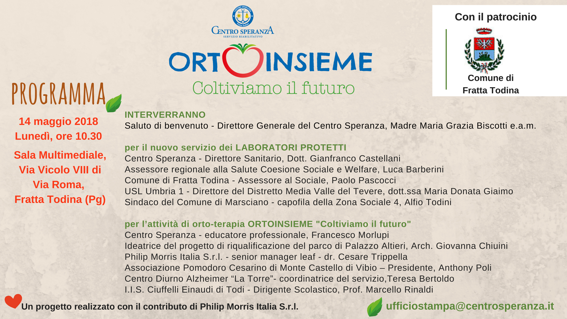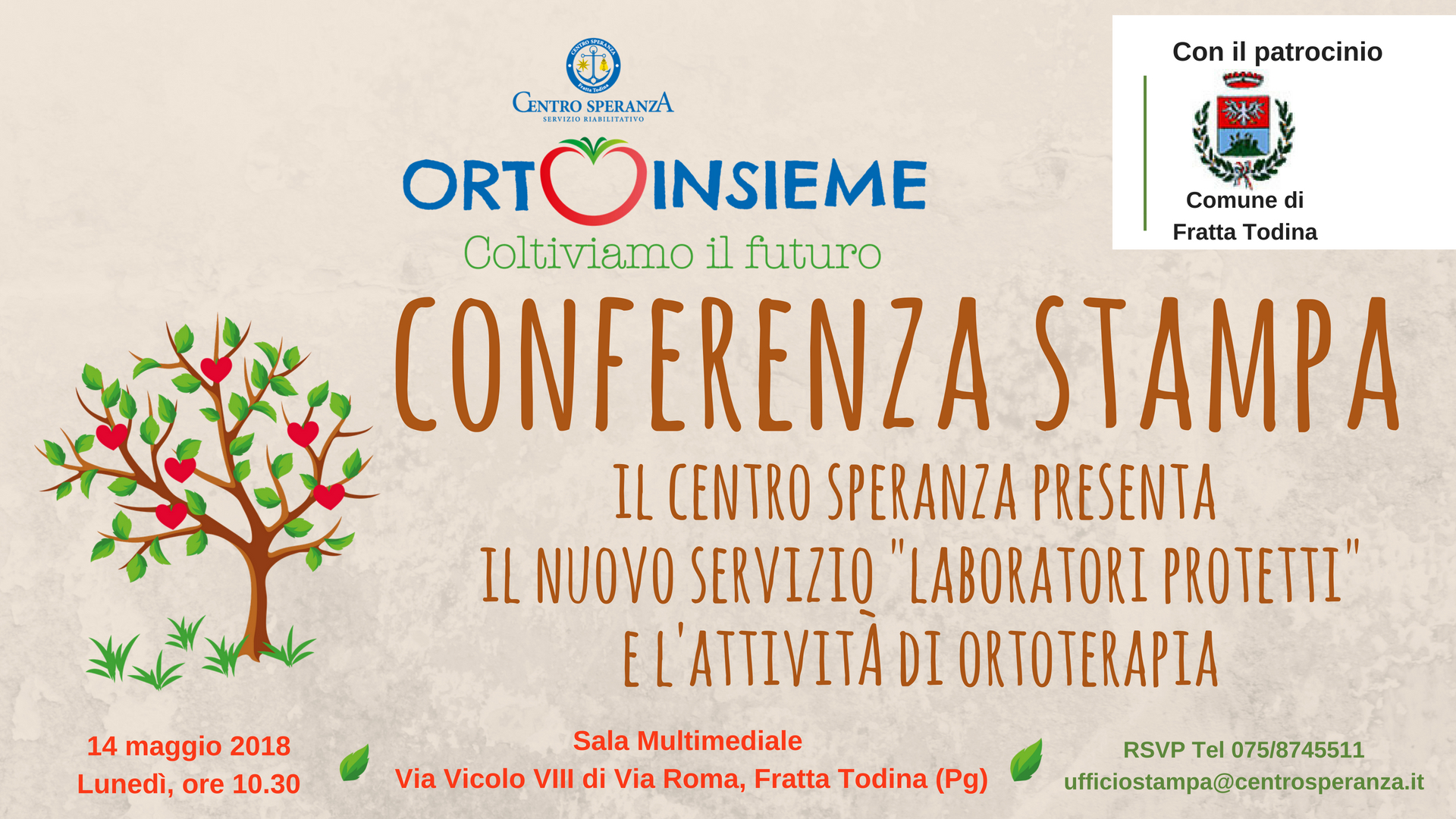 Lunedì 14 maggio alle ore 10.30 presso la Sala Multimediale del Comune di Fratta Todina, in Via Vicolo VIII di Via Roma, si terrà la conferenza stampa di presentazione del nuovo servizio dei "laboratori protetti" e dell'attività di orto-terapia.
