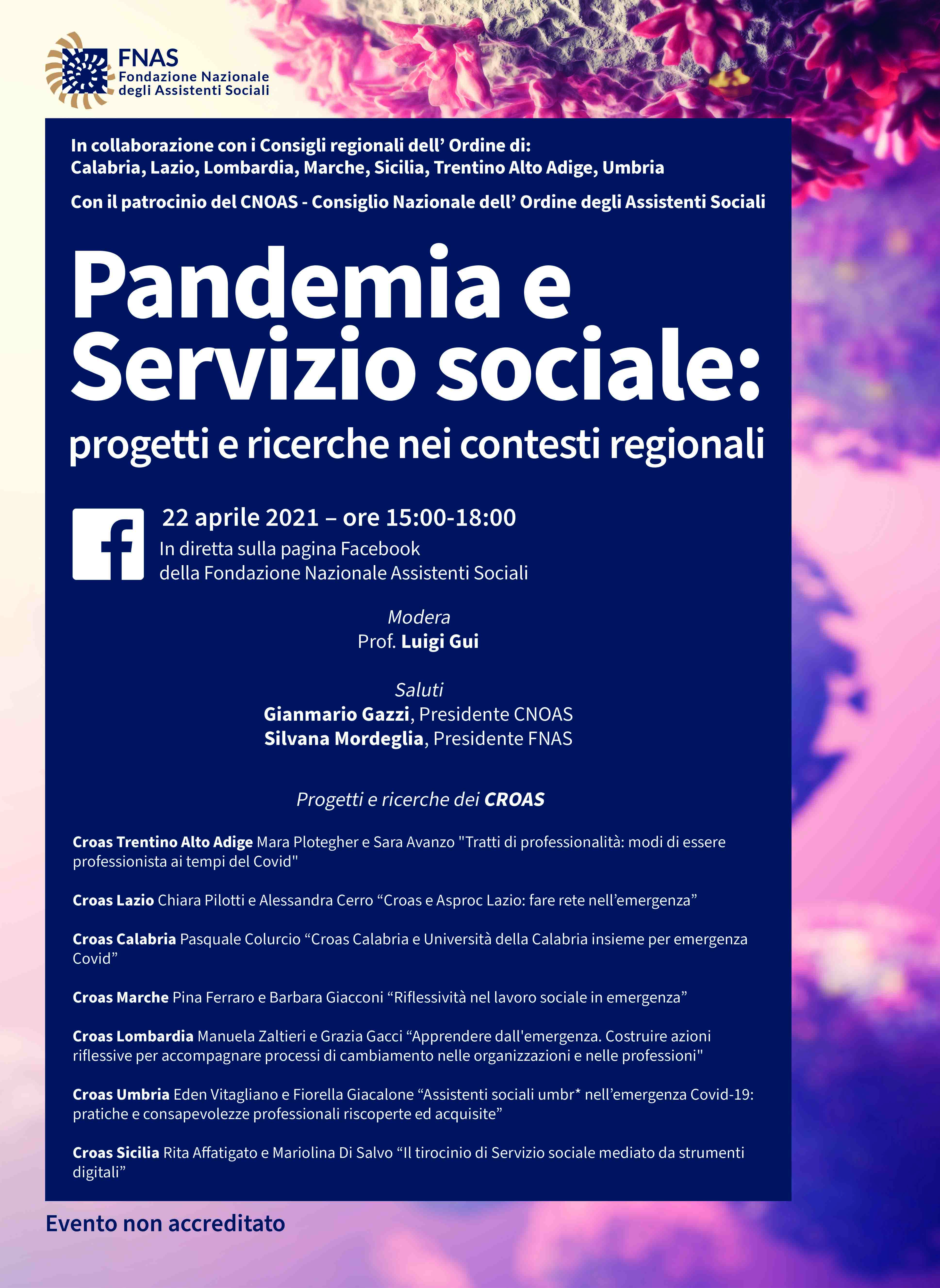 Il CROAS Umbria ha accolto l'invito della Fondazione Nazionale Assistenti Sociali a partecipare al Convegno nazionale "Pandemia e Servizio Sociale: progetti e ricerche nei contesti regionali" che si terrà il giorno 22 aprile dalle ore 15.00 alle ore 18.00.