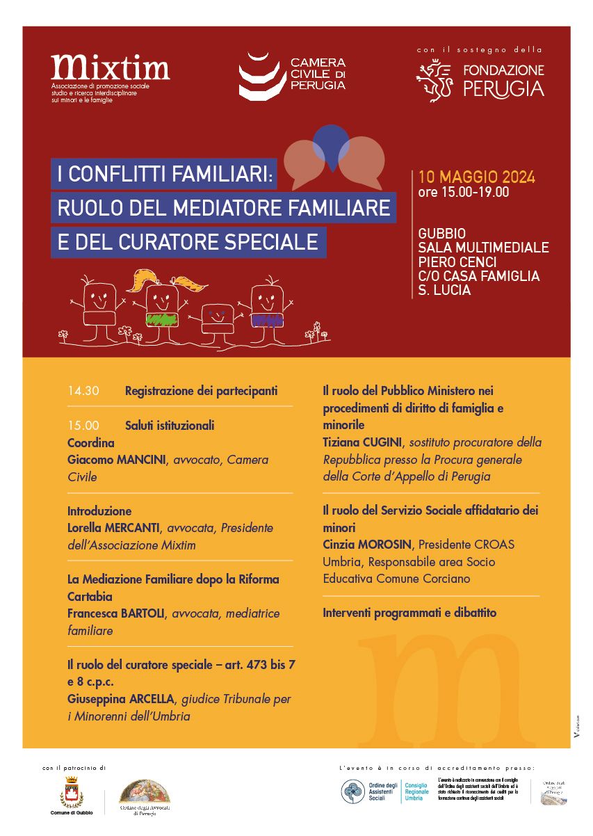 L'evento formativo si terrà il 10 maggio 2024 dalle ore 15:00 alle ore 19:00 a Gubbio - Sala Multimediale Piero Cenci c/o Casa Famiglia Santa Lucia.