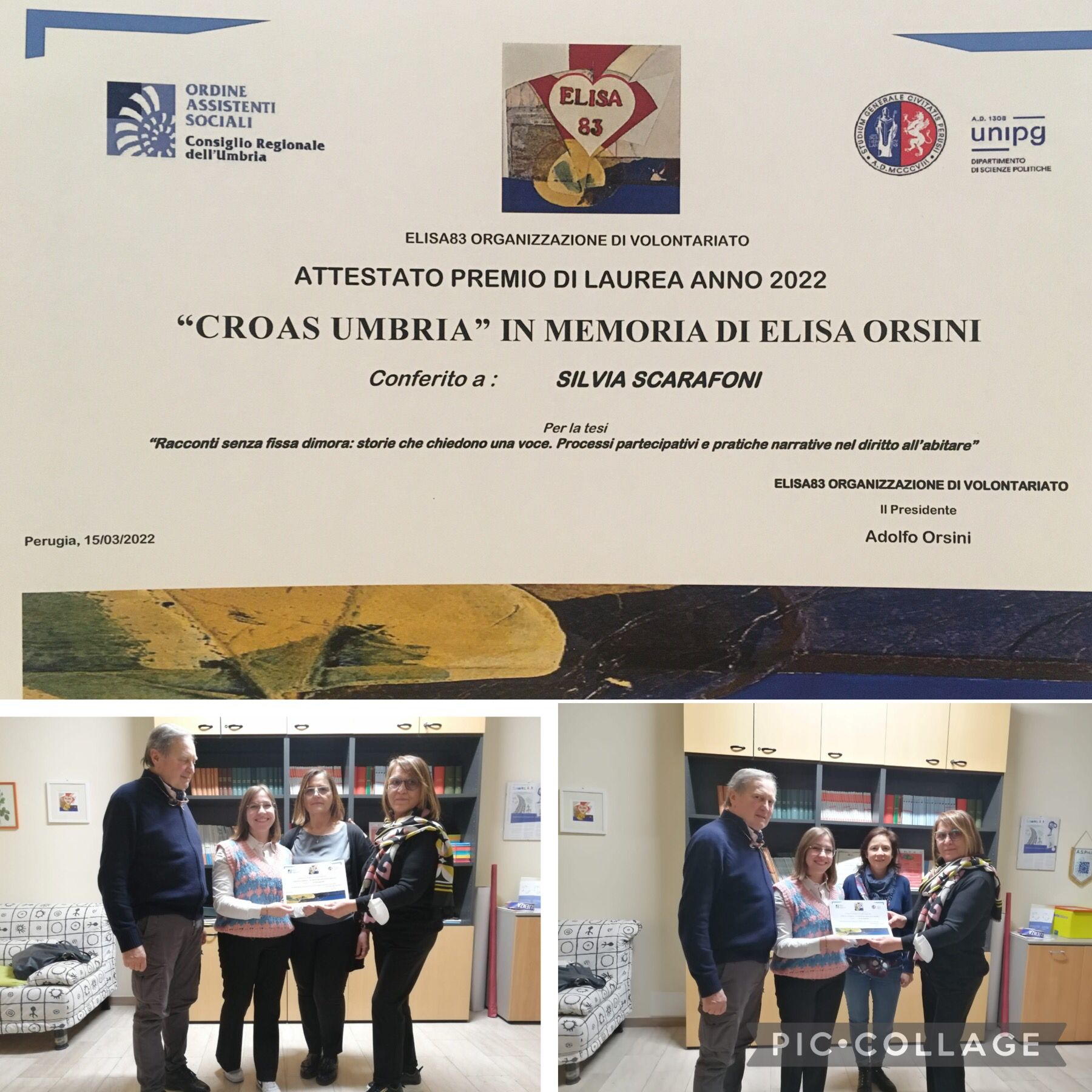Il Consiglio dell’Ordine degli Assistenti Sociali ha proclamato vincitrice del 1° Premio di Laurea “Croas Umbria” in memoria di Elisa Orsini, finanziato dall’Associazione di Volontariato “Elisa83” ODV, la tesi di Laurea Magistrale della Dott.ssa Silvia Scarafoni dal titolo “Racconti senza fissa dimora- storie che chiedono una voce. Processi partecipativi e pratiche narrative nel diritto all’abitare”.