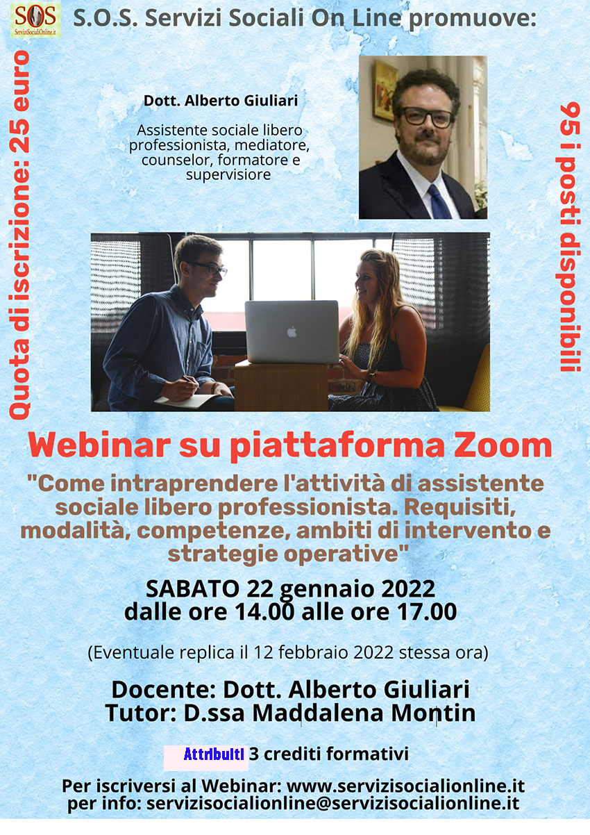 Il webinar si svolgerà il 22 gennaio 2022 dalle ore 14.00 alle ore 17,00 sulla piattaforma Zoom e prevede l'interazione tra i discenti, il docente e la tutor. Sono previste anche esercitazioni. Il webinar prevede spazi di dibattito e discussione.